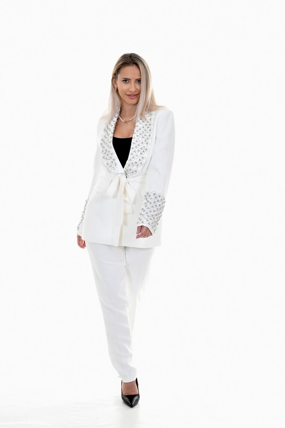 Costumul Daya este o piesă statement cu inspirație couture, creat pentru femeia care își dorește o apariție memorabilă, rafinată și puternică. Realizat într-o nuanță alb elegant, acest costum impresionează prin reverul amplu decorat cu aplicații strălucitoare și prin finisajele impecabile, fiind ideal pentru evenimente speciale și ocazii exclusiviste.