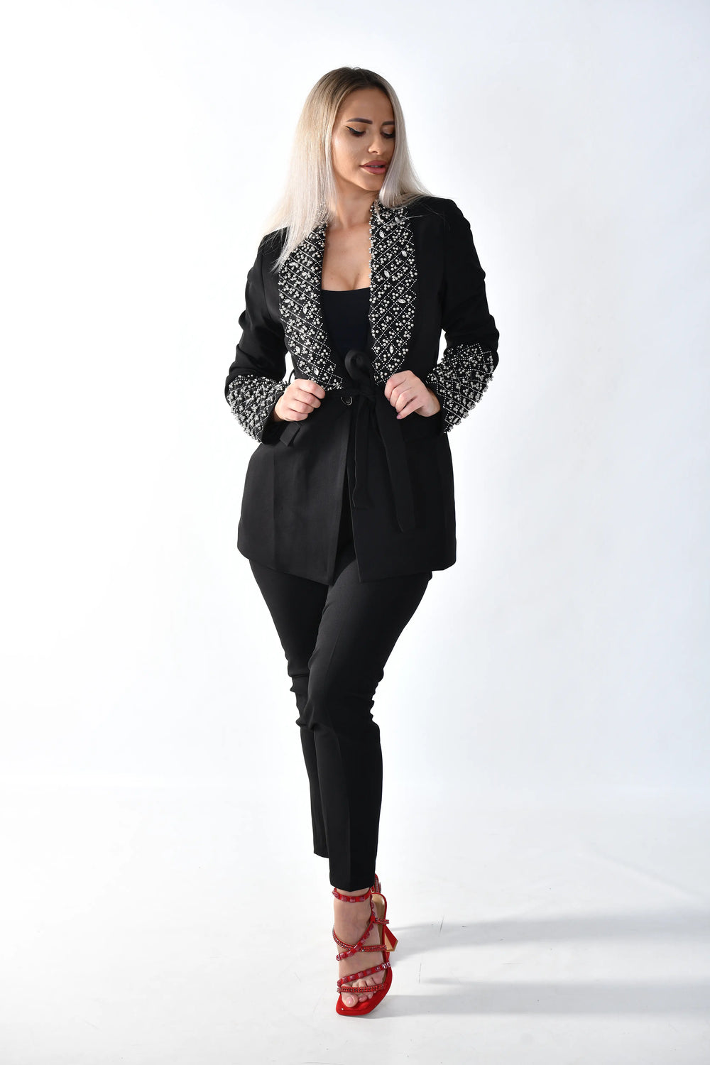 Sacoul are o croială cambrată, cu închidere tip wrap și cordon în talie, care subliniază silueta într-un mod elegant și feminin. Reverul amplu, decorat cu aplicații cu efect strălucitor, devine punctul central al ținutei, aducând un plus de lux și stil. Buzunarele funcționale și finisajele curate completează designul modern.