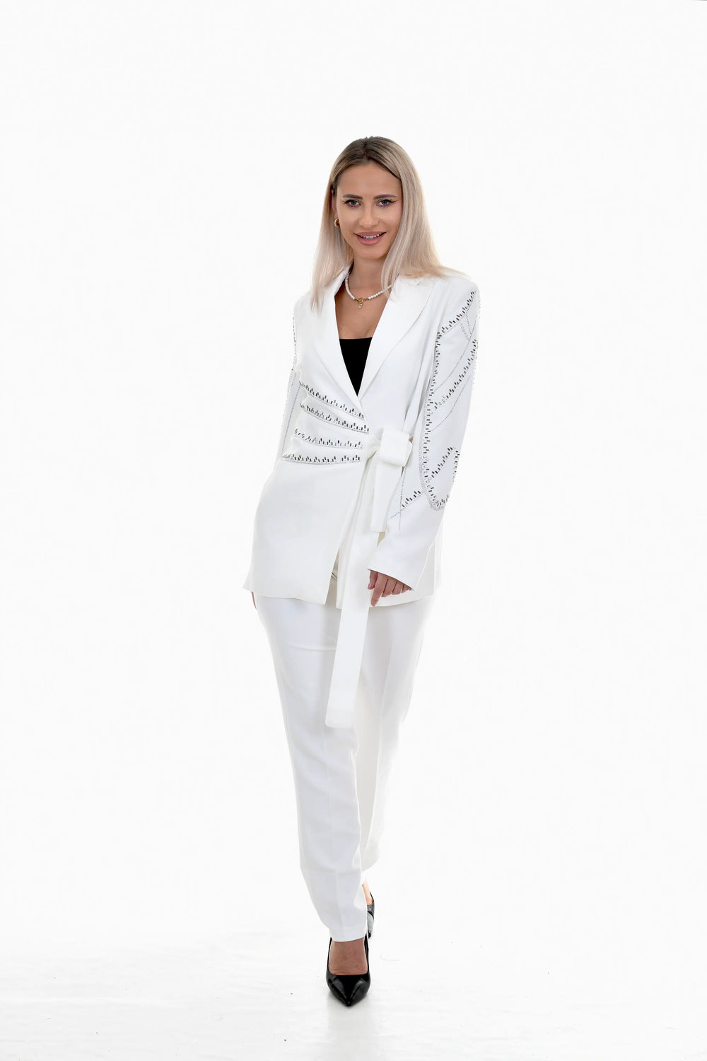 Costumul Saya este o piesă statement cu design contemporan, creată pentru femeia care își dorește un look sofisticat, modern și bine definit. Realizat într-o nuanță alb elegant, acest costum se remarcă prin broderiile geometrice cu aplicații strălucitoare, care adaugă un plus de originalitate și rafinament ținutei.